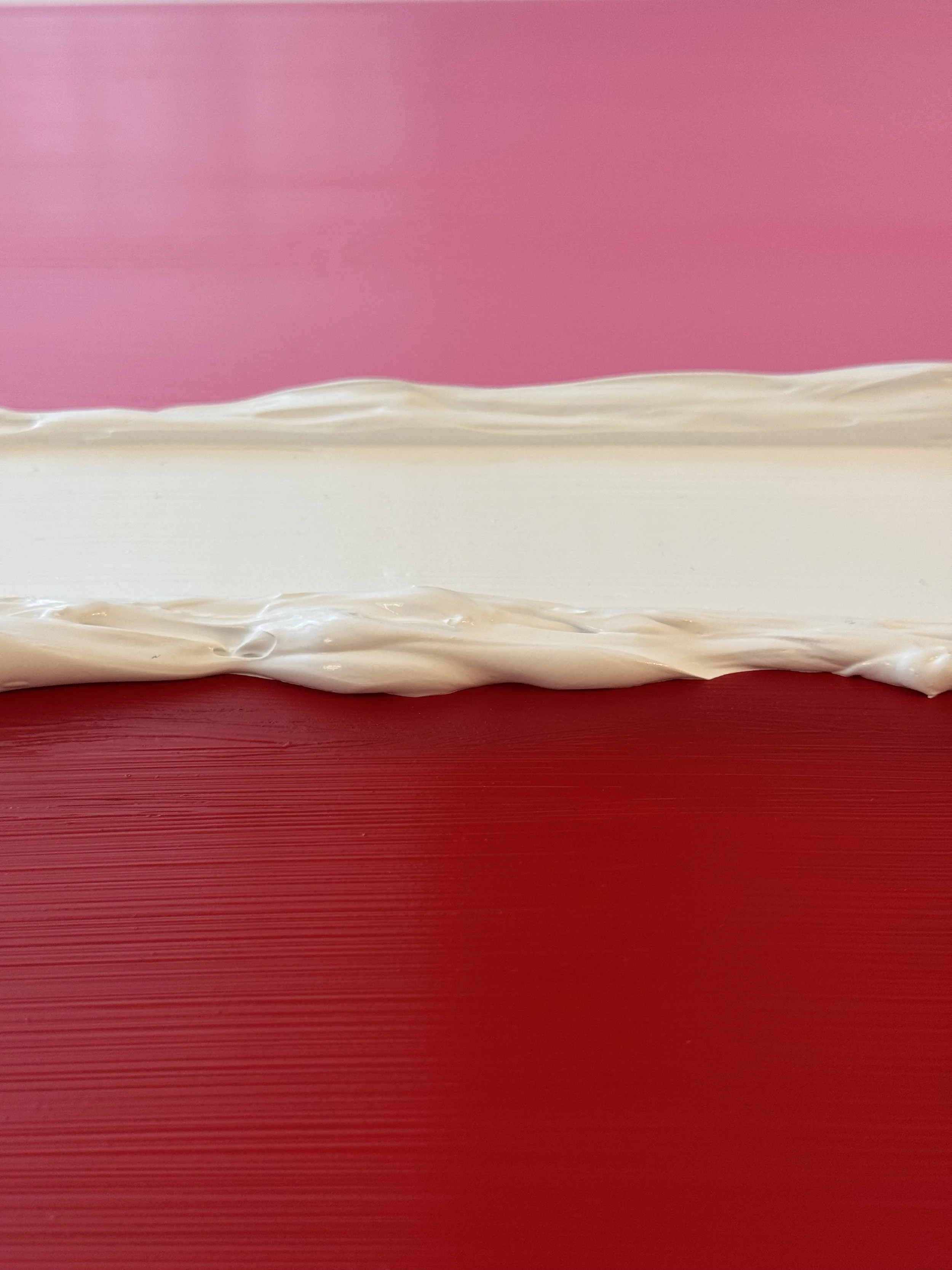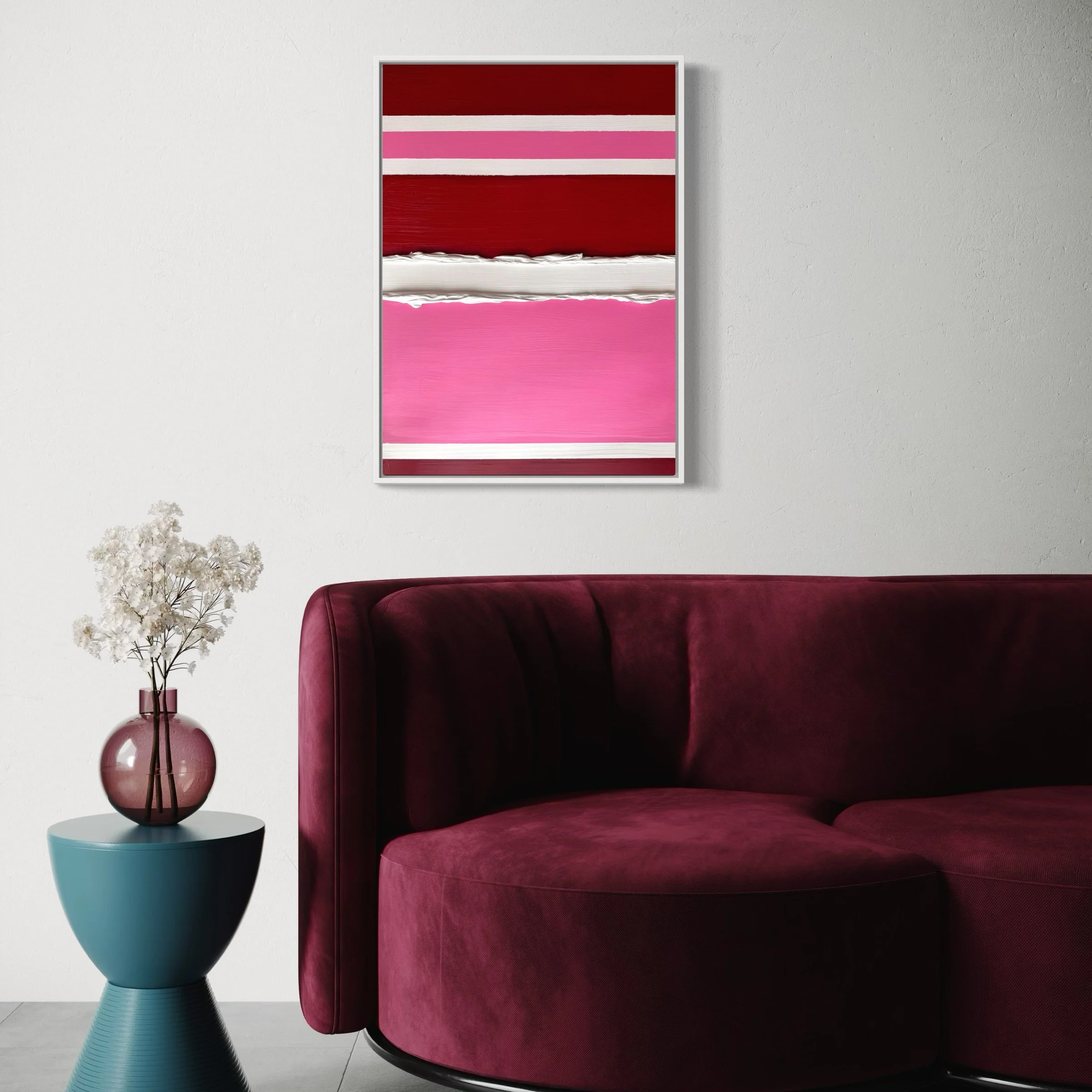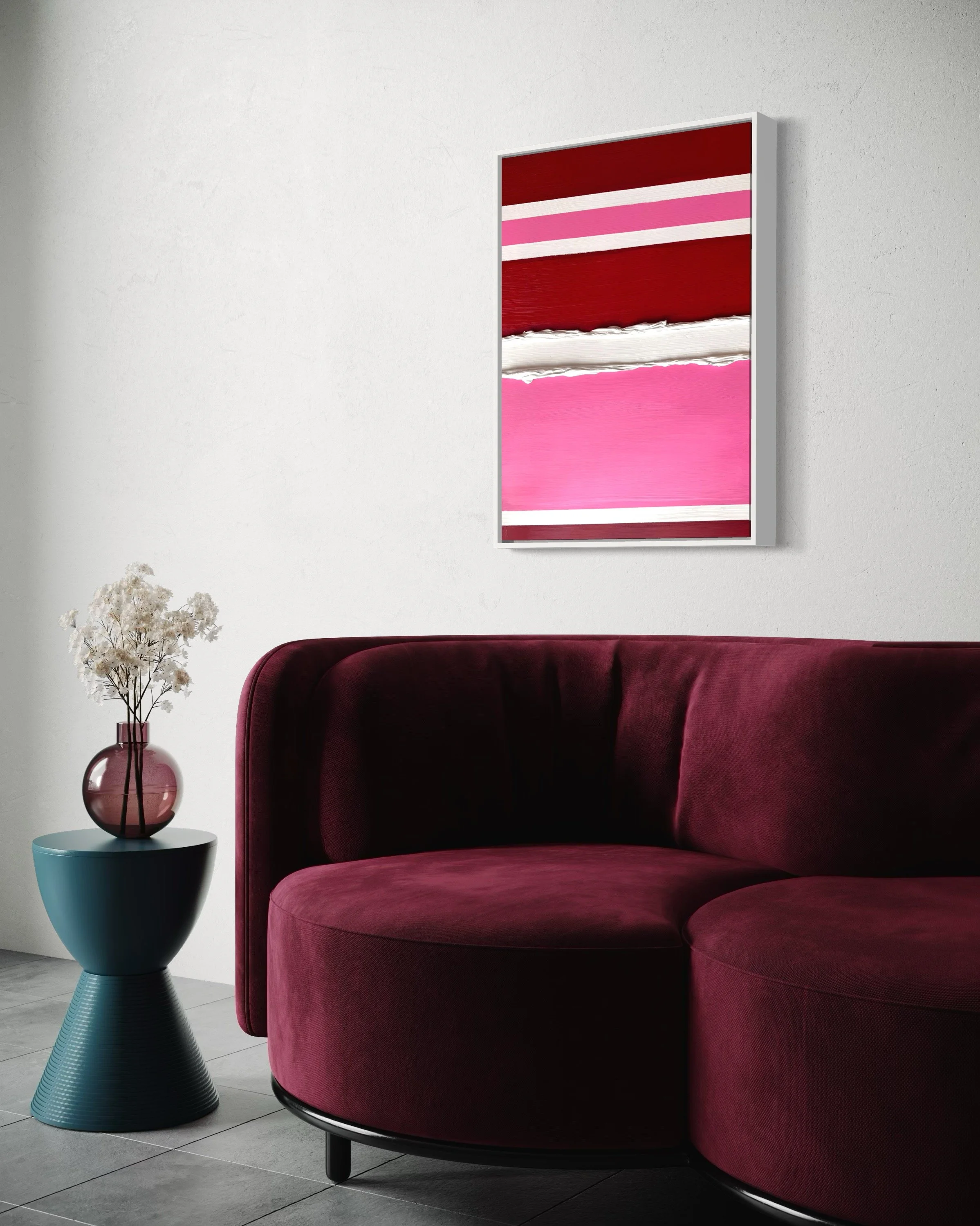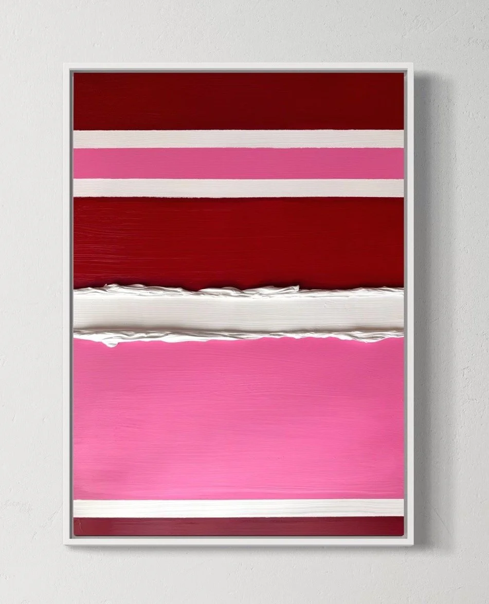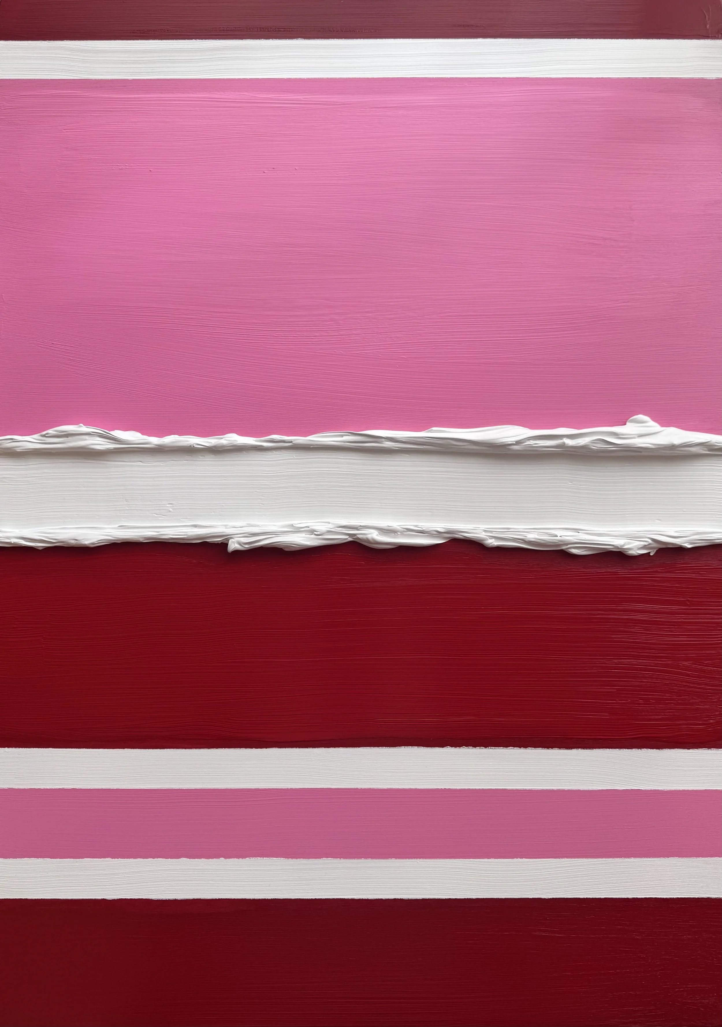 Layered Delight is a vibrant acrylic painting on a wooden panel, evoking the sensory richness of an exquisite pastry. Its shades of pink and red recall the delicate layers of a gourmet dessert, while the thick, sculptural white textures resemble whipped cream carefully spread across the surface. The interplay of colors and textures creates a subtle balance between softness and intensity, abstraction and nostalgia.